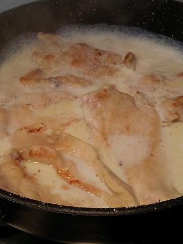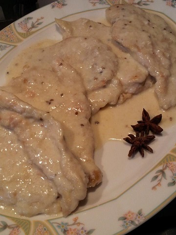 Infarinate le fettine di petto di pollo e mettetele in padella dopo aver fatto sciogliere poco burro. Fatele rosolare da entrambi i lati. Ora coprite a filo con il latte.Salate, aggiungete alcuni semi di anice e lasciate cuocere fino a quando il latte si sarà addensato creando una cremina. Servite subito, coprendo con la salsa di cottura e dell'anice stellato se lo avete.